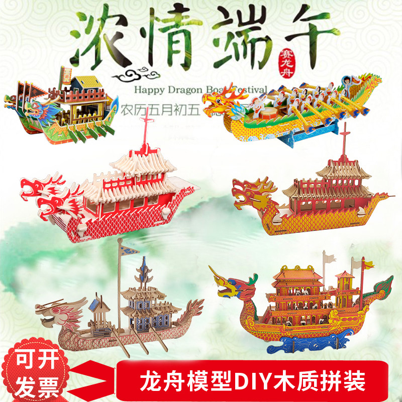 龙舟模型手工diy木质3d立体拼图木制积木端午节儿童礼品龙船玩具热门设计联盟服务商