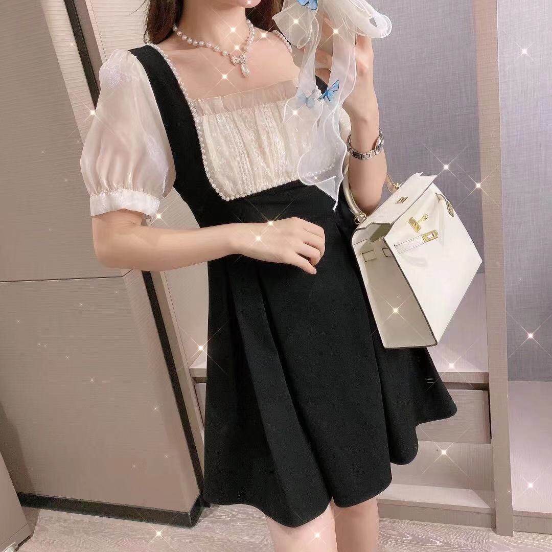 梦露郭郭推荐网红法式方领网纱拼接连衣裙夏新款复古设计感长短裙热门设计联盟服务商