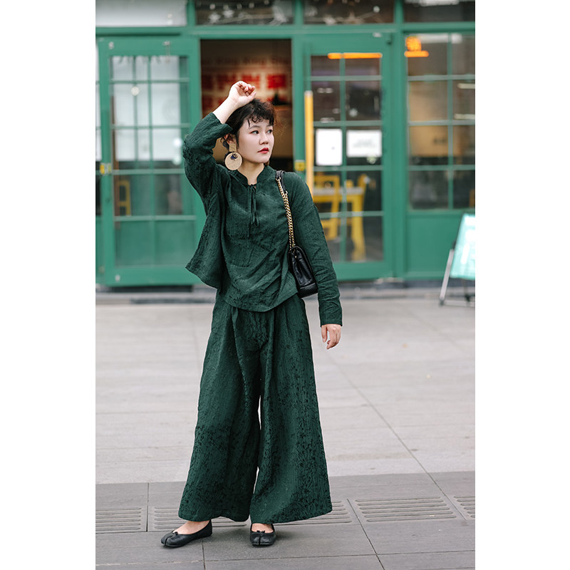 绽放564-565朵/复古墨绿色设计感天丝亚麻衬衫阔腿休闲裤套装女热门设计联盟服务商